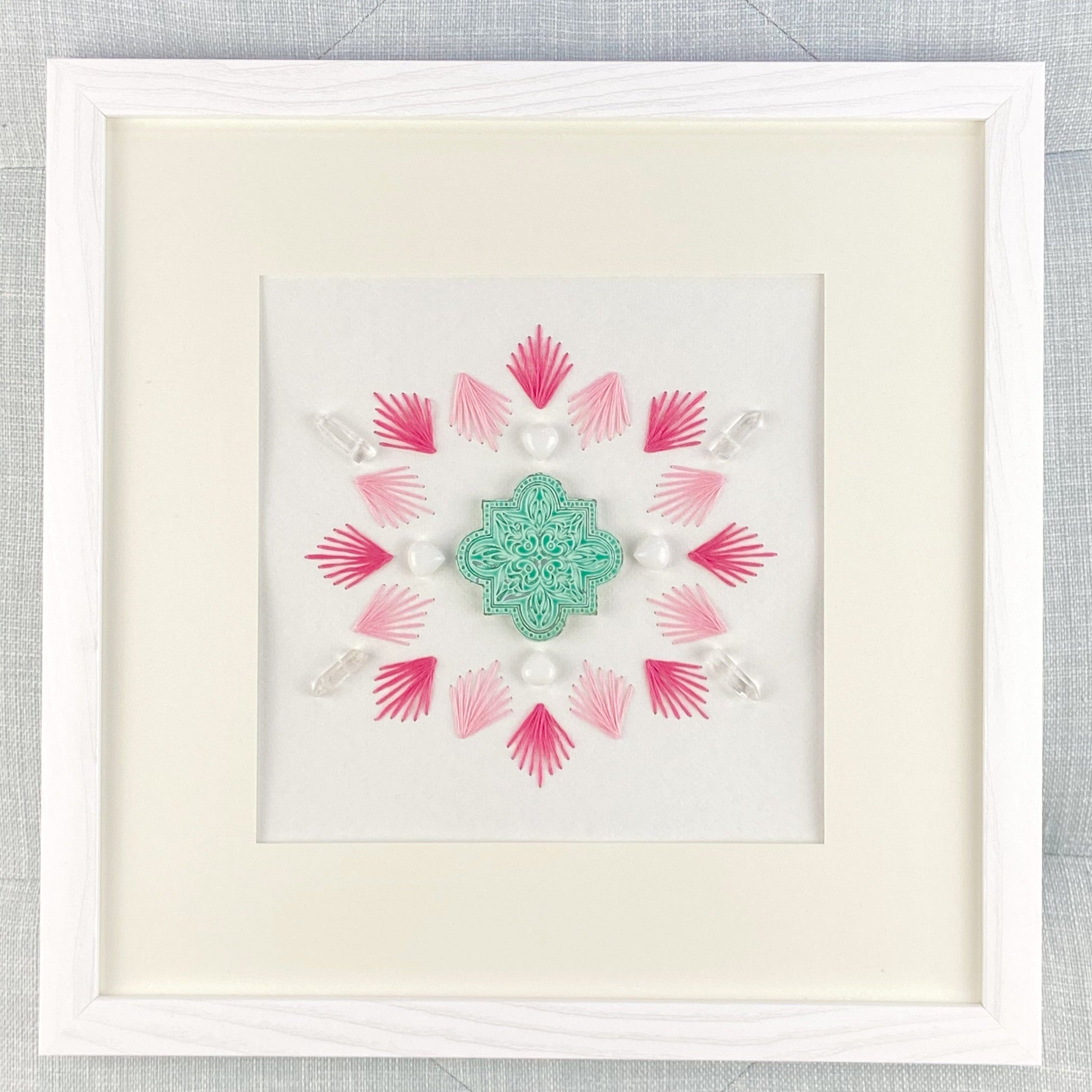 Framed Hand-Stitched Sacred Geometry Crystal Grid 13 x 13", Pink, Aqua & White
