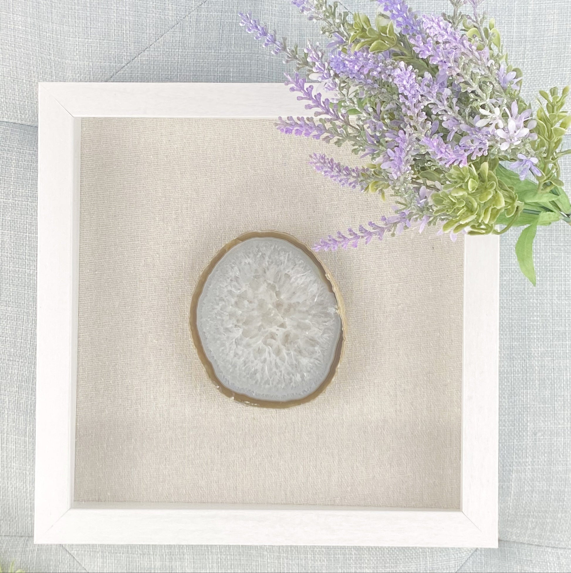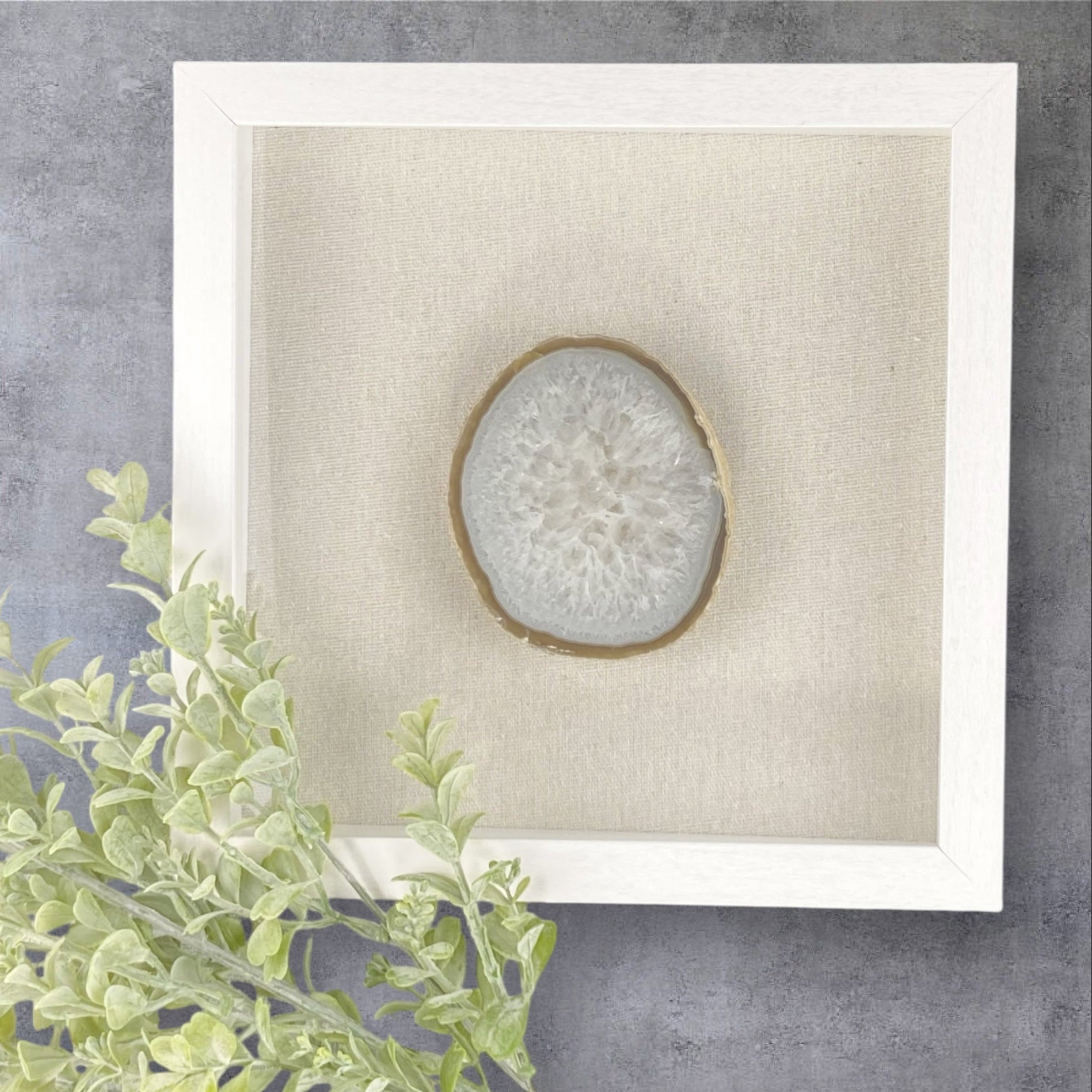 Add natural elegance and radiant energy to your home with this one-of-a-kind clear agate in a white frame. Measuring 9 x 9", this tasteful wall art pairs Scandinavian minimalism with the beauty of nature.