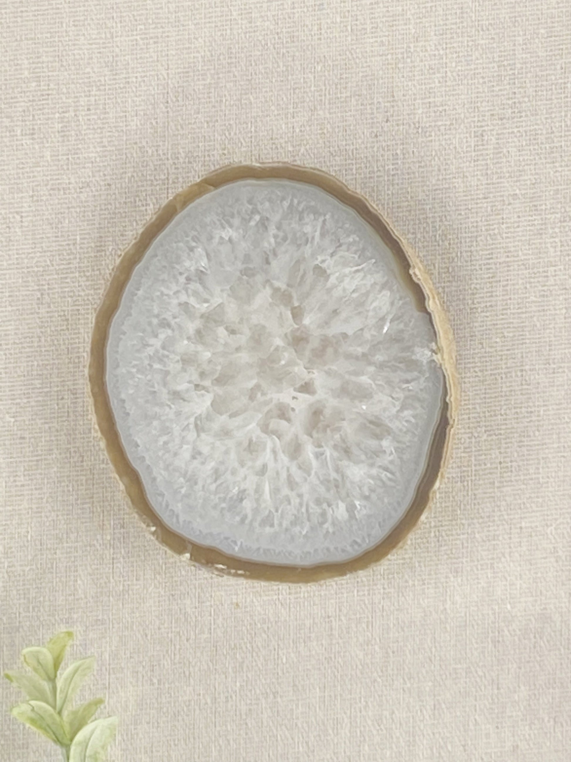 ✨ The thick clear Brazilian agate slice, is known for its joyful, uplifting energy and sparkling crystalline texture.