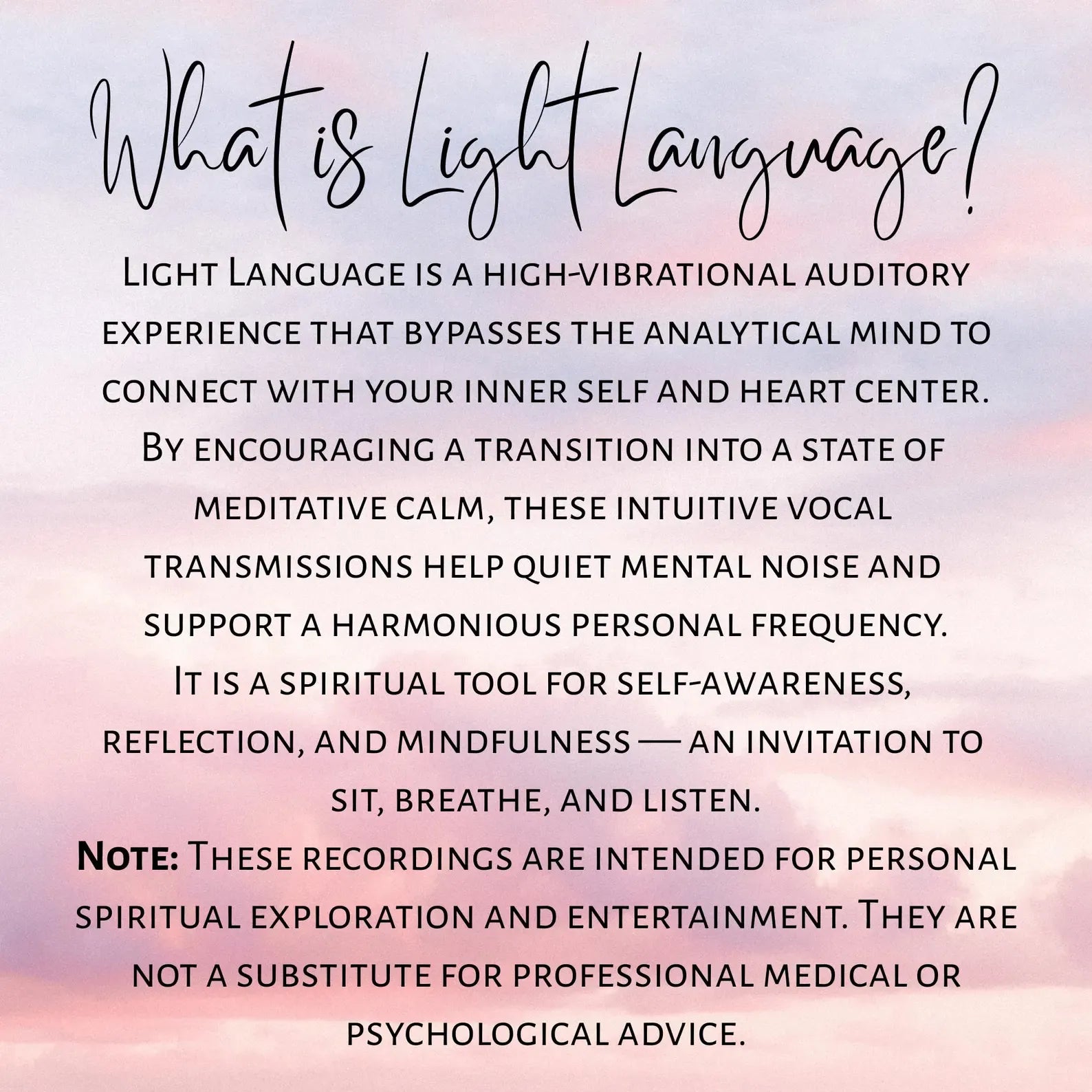 Recorded live in the quiet energy of Waterbury, Vermont, this session features five different channeled "light languages." Think of light language as a form of abstract vocal expression—often called the "language of the soul." Because it doesn't use standard words, it helps you get out of your head and back into your heart.