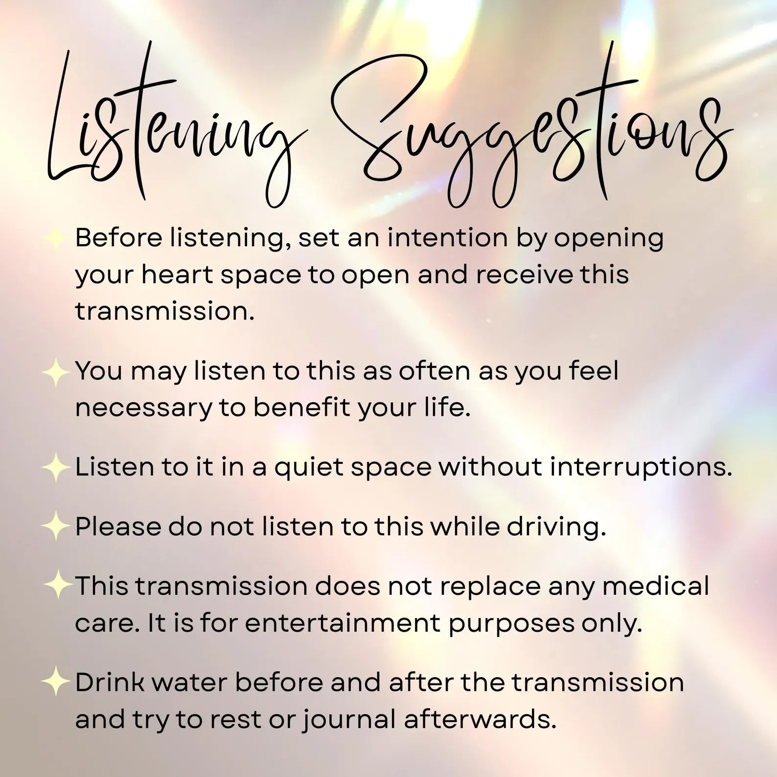 - The Transmission (15 mins): Channeled tones and frequencies from five unique languages.
