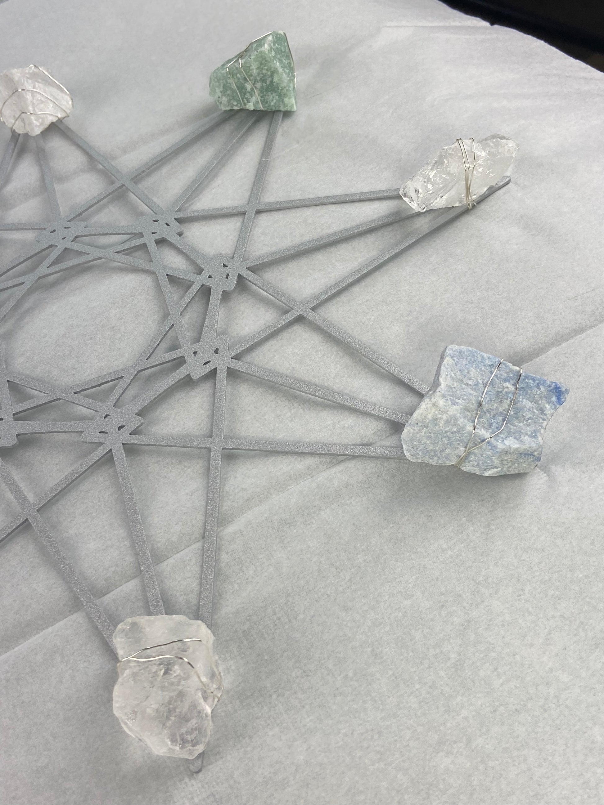 Materials: Silver-finish die-cut steel, 8 Quartz and Aventurine raw crystals (wire-wrapped)