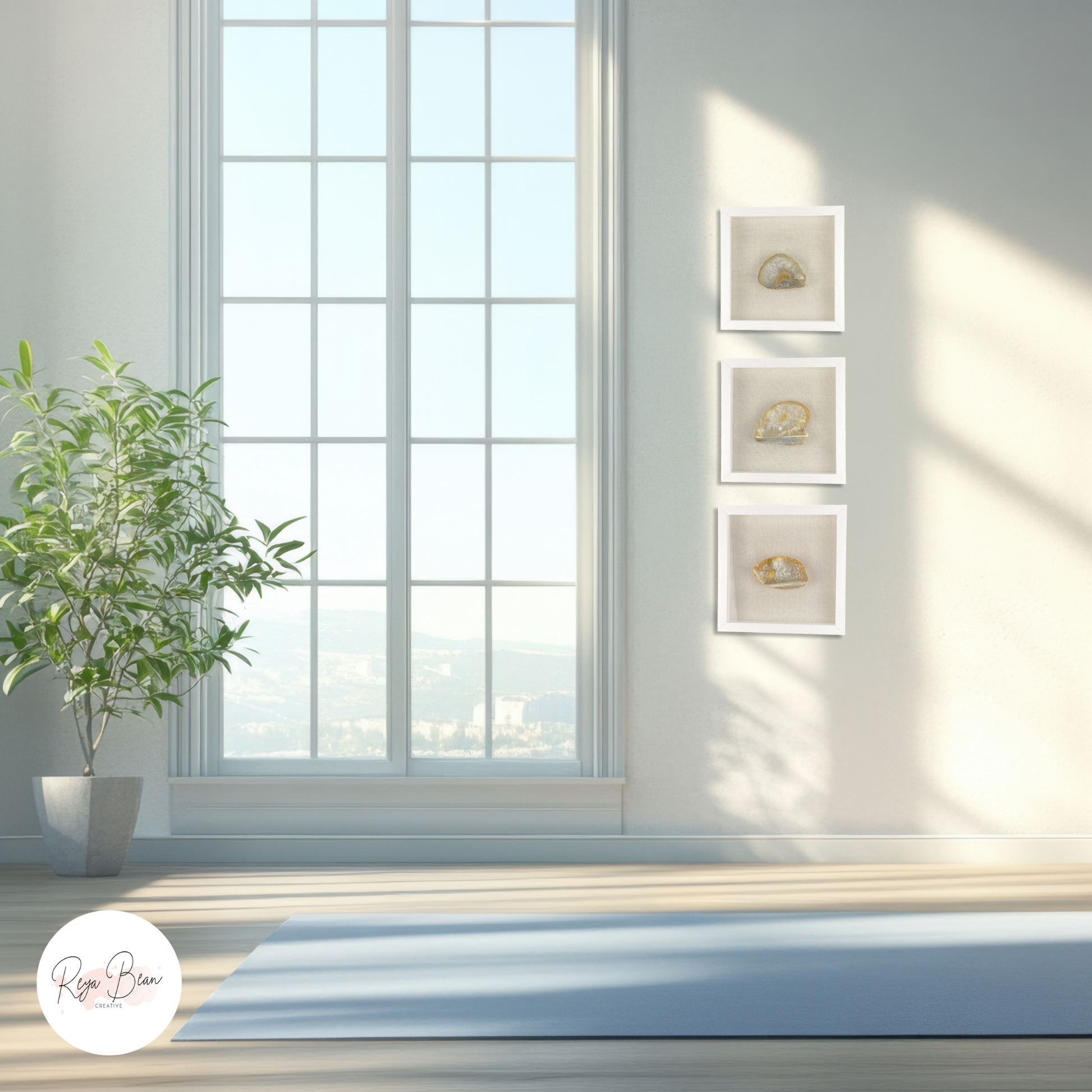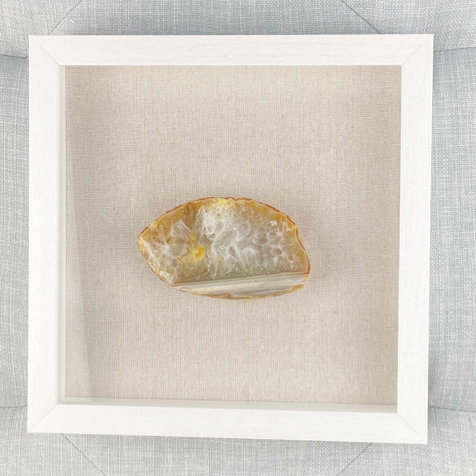 Add natural elegance and radiant energy to your home with this one-of-a-kind set of 3 yellow agates in white frames. Measuring 9 x 9" each, this set pairs Scandinavian minimalism with the beauty of nature.