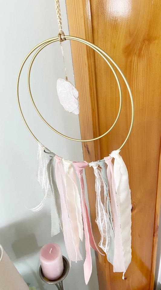 Sacred Geometry Metal Ribbon Wire-wrapped Rose Quartz Suncatcher, One of a Kind 10"