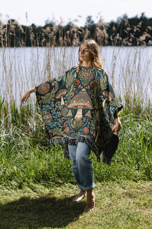 Forest Mushroom Motif Boho Poncho, 50" x 60"
