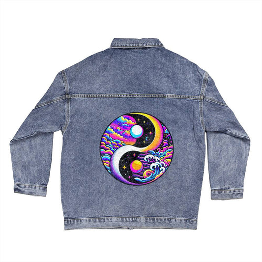 90s Yin Yang Sun Moon Stars - Women's Printed Oversized Jean Jacket